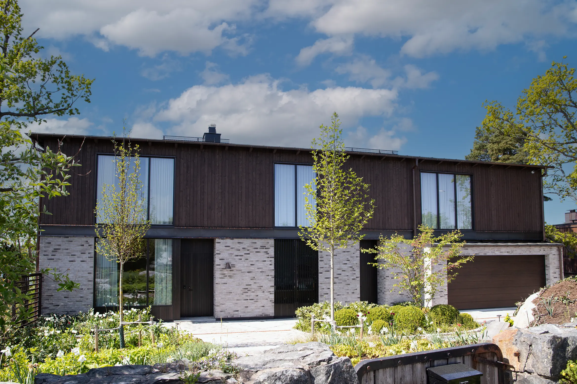 Skjutpartier, fönster, fönsterdörrar och entrédörrar i mörkpigmenterad massiv ek på in och utsidan.