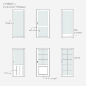 Finns med 2-glas eller 3-glas isolerruta. Som standard levereras isolerrutorna med energiglas. Vi har tillgång till samtliga fabrikat. Glastyp väljs efter kundens önskemål och behov, t.ex. inbrottssäkra glas, eluppvärmda m.m.