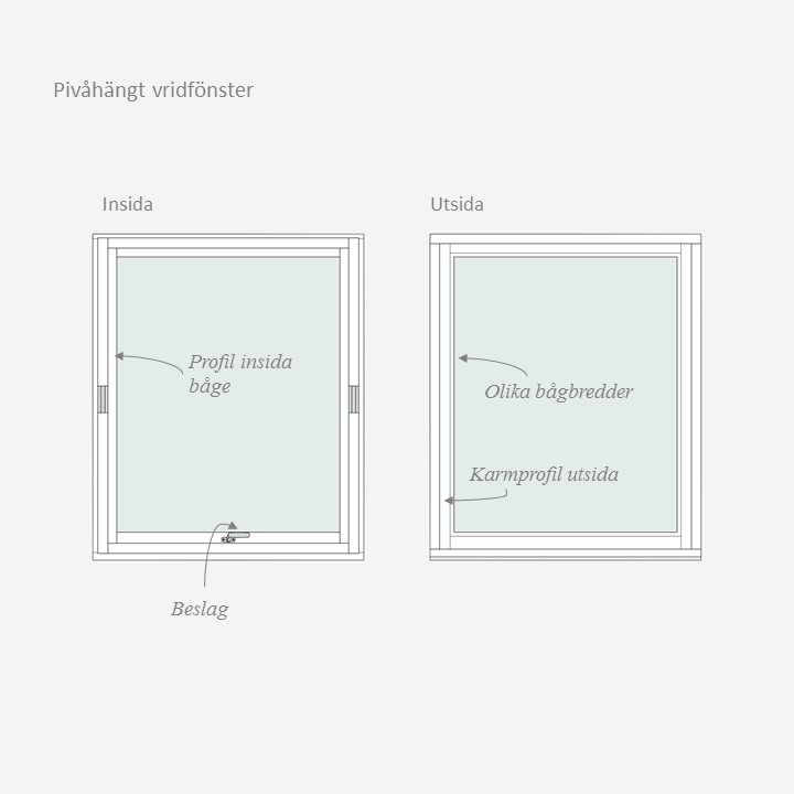 Våra pivåhängda vridfönster finns i olika utföranden. Valet av vilket som passar bäst kan ofta bero på om det är till ett nyproducerat hus eller om profiler ska anpassas till en viss tidsepok. Fönstertypen passar bra att kombinera ihop med våra utåtgående enkelbågfönster samt fasta fönster.